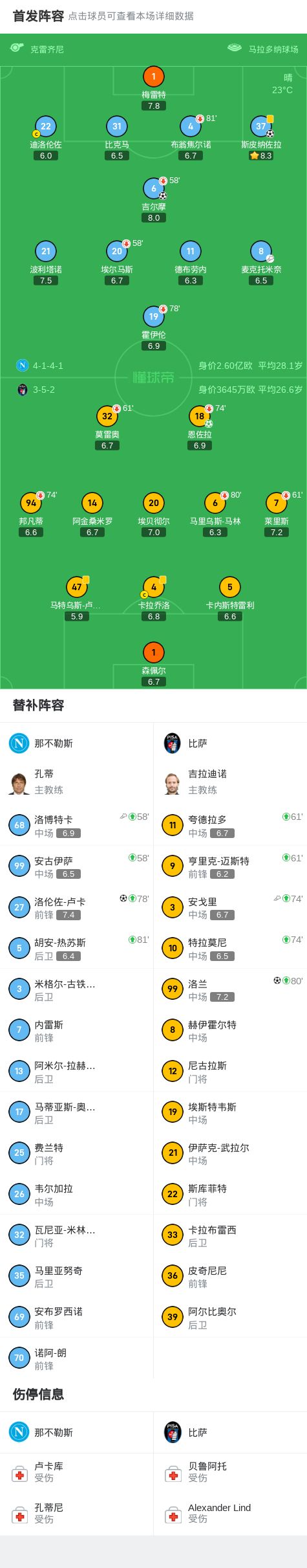 北京时间9月23日意大利足球顶级联赛 联赛 第4轮,那不勒斯主场对阵比萨。那不勒斯吉尔摩破门,斯皮纳佐拉破门,洛伦佐-卢卡破门。比萨恩佐拉破门,洛兰破门。最终比分那不勒斯 3-2 比萨。