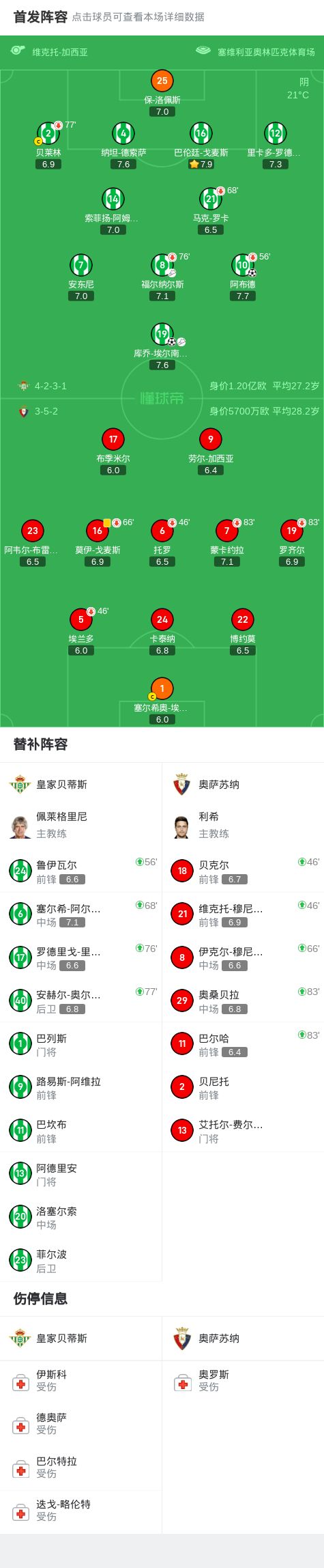 第18分钟,贝蒂斯前场断球,阿布德禁区抽射破门,贝蒂斯1-0奥萨苏纳