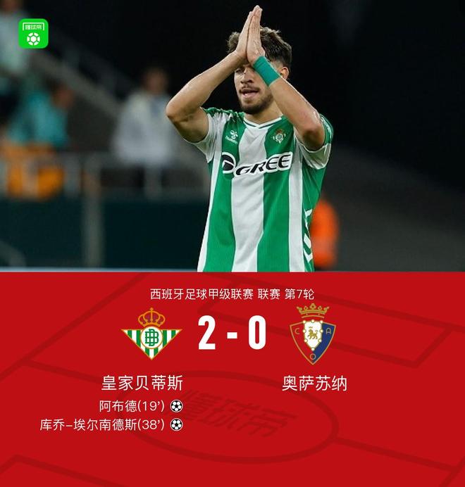 贝蒂斯2-0完胜奥萨苏纳,阿布德、库乔-埃尔南德斯破门