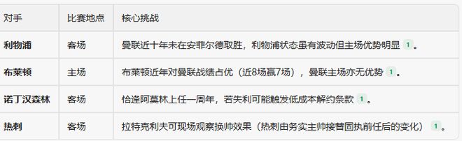 未来几周,曼联将连续对阵利物浦(客场)、布莱顿(主场)、诺丁汉森林(客场)和热刺(客场),其中三场为客场作战。